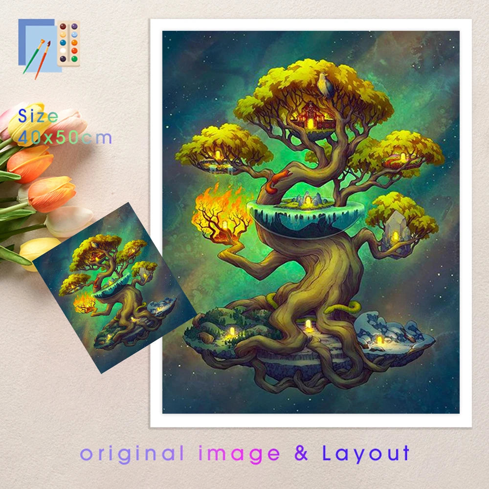 Fantasy 'Blazing Serenity: Bonsai Beneath the Northern Lights' Paint by Numbers Description: